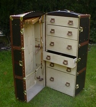 LOUIS VUITTON Goyard was the main competitor to Vuitton until the 1940s and has had such clients as the Duke and Duchess of Windsor, Picasso and the Aga Khan. This imposing wardrob trunk is classic Goyard <<precede follow>>